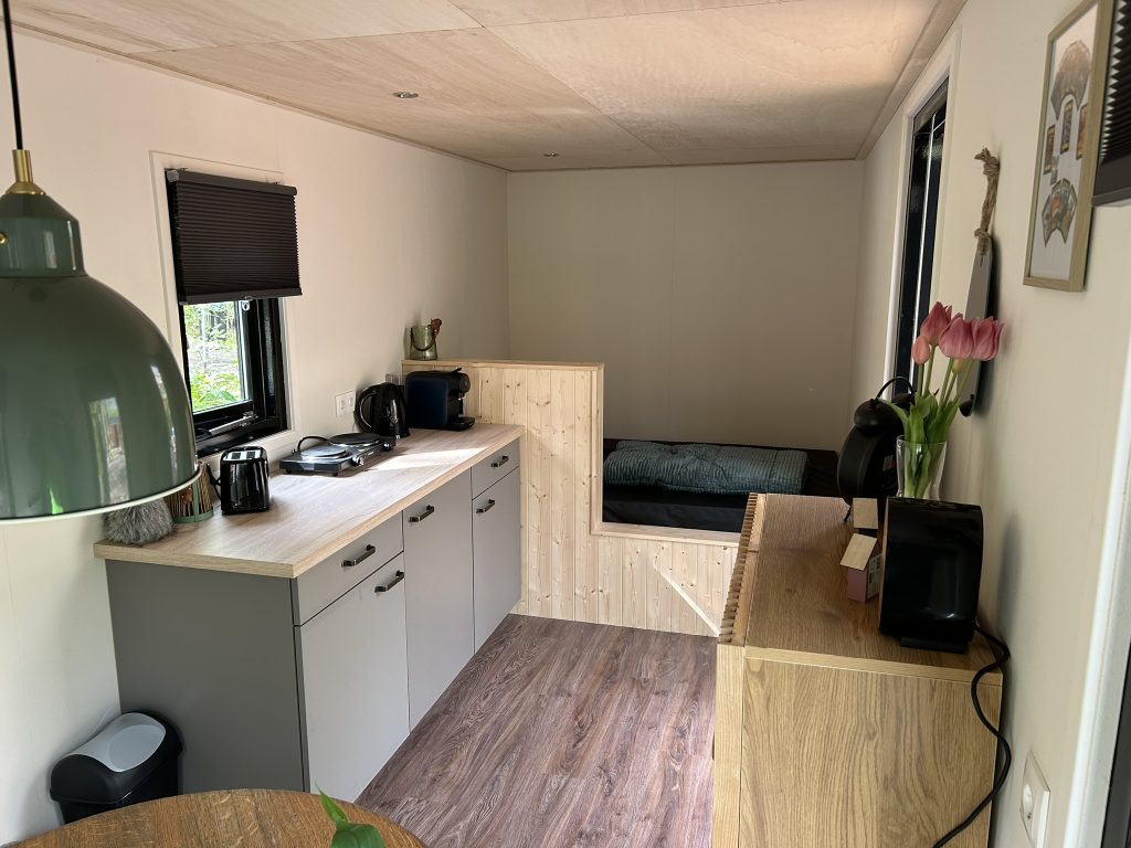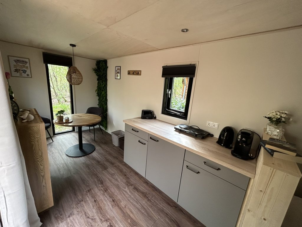 De 6 tiny houses zijn bedoeld voor 2 tot 4 gasten en omdat ze bij elkaar staan in een hoek van de camping zijn ze ook ideaal voor (grotere) families. In het midden staan twee grote picnictafels om samen aan te ontbijten en lunchen of savonds samen te borrelen. Alle tiny houses zijn voorzien van een zithoek en een keukentje met koelkast, koffiezet-apparaat (cups) en waterkoker en een kookplaatje met meerdere pannen. Uiteraard zijn de tiny houses ook voorzien van alle serviesgoed voor respectievelijk 2 of 4 gasten (incl. kinderen). De tiny houses zijn goed geïsoleerd, maar er is een kacheltje en een ventilator aanwezig.